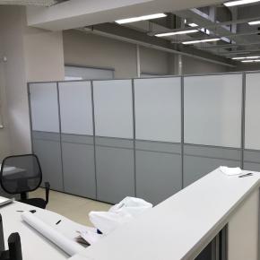 Мобильные перегородки с глухой частью и стеклом состоят из отдельных модулей, которые легко стыкуются между собой. Внутри перегородок размещены коммуникации и выведены наружу необходимые разъёмы. Высота перегородок 180 см и 197 см, ширина секций тоже разная: 70, 80, 90, 100 см, подогнана под размер помещения. При необходимости перегородки можно легко демонтировать и переставить.