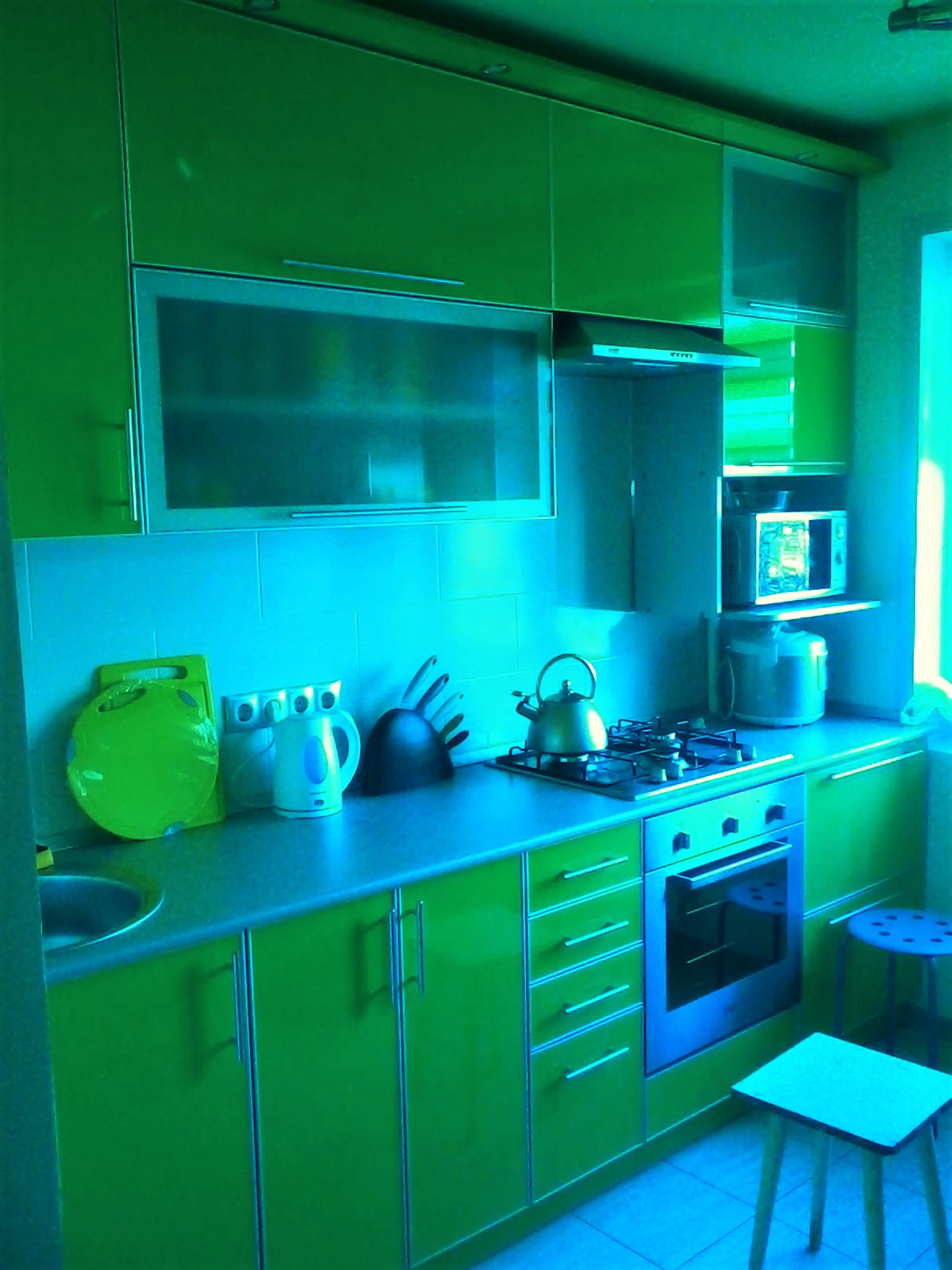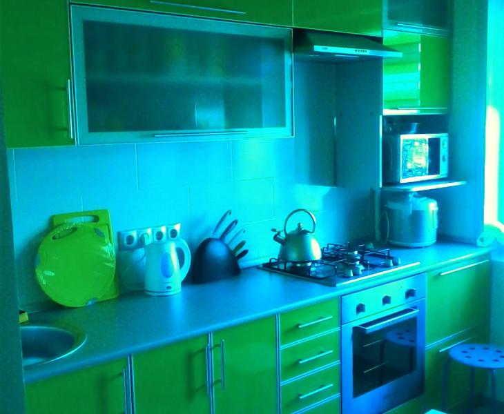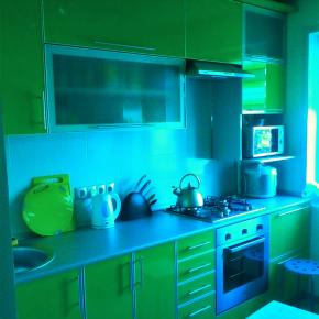 Клиенту был предложен яркий вариант фасадов из итальянского пластика Arpa, поскольку кухня находится на теневой стороне дома и солнечный свет проникает в нее довольно редко. Был выбран зеленый цвет в классическом сочетании с серым. Клиент остался доволен, ведь даже в пасмурный день данная кухня радует его своей яркостью и свежестью!