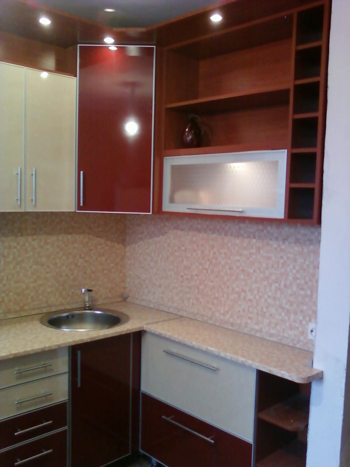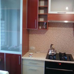 Кухня, выполненная в бордово-молочных тонах, придется по вкусу личности творческой и романтичной. Наличие большого количества открытых полок свидетельствует о любви человека к предметам декора. Именно это клиент и просил отразить в данном проекте. Как итог - Клиент доволен – мы довольны!