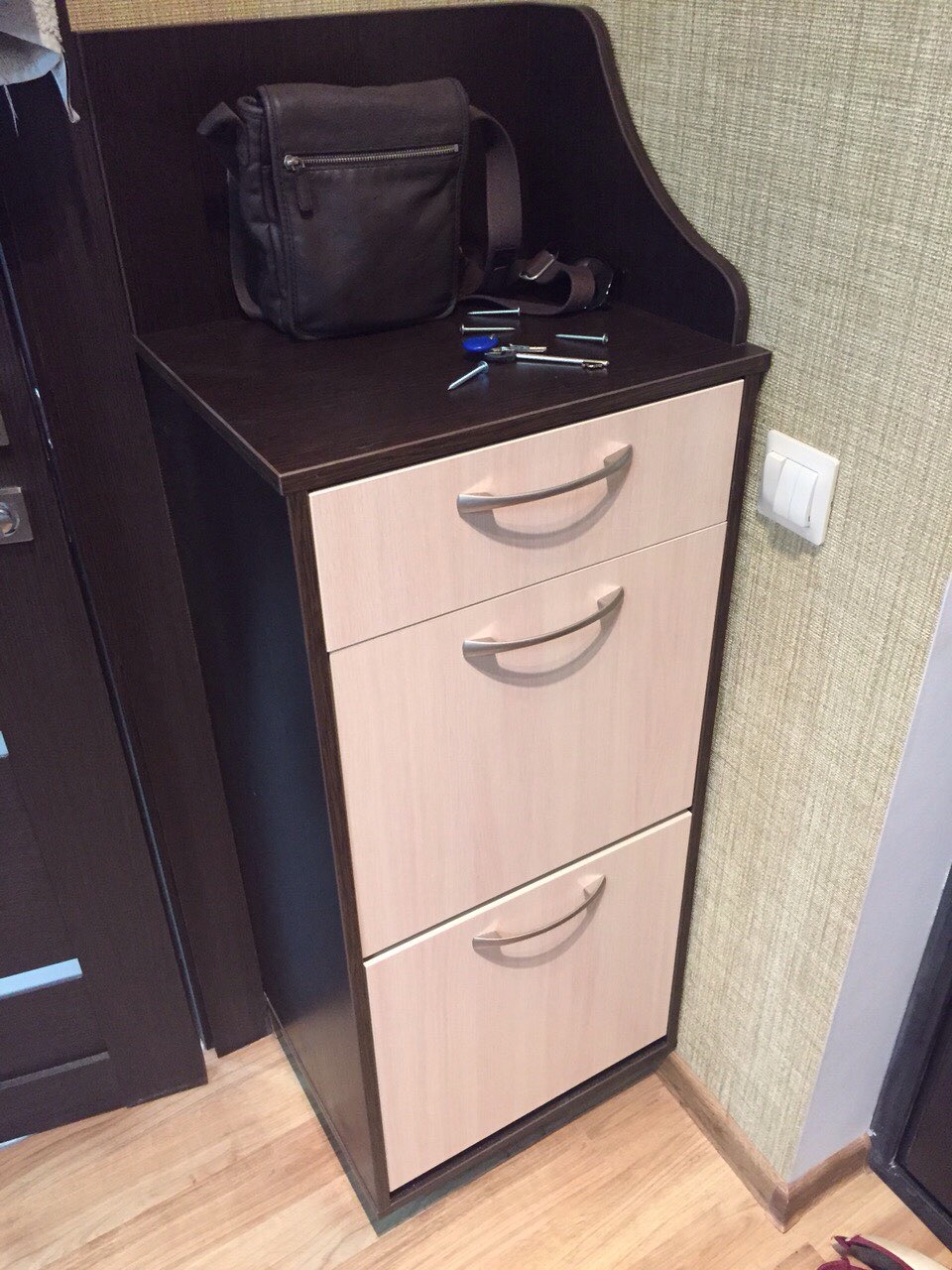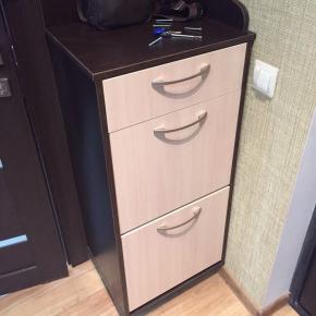 Тумба с двумя выдвижными отделениями для обуви и верхним выдвижным ящиком.